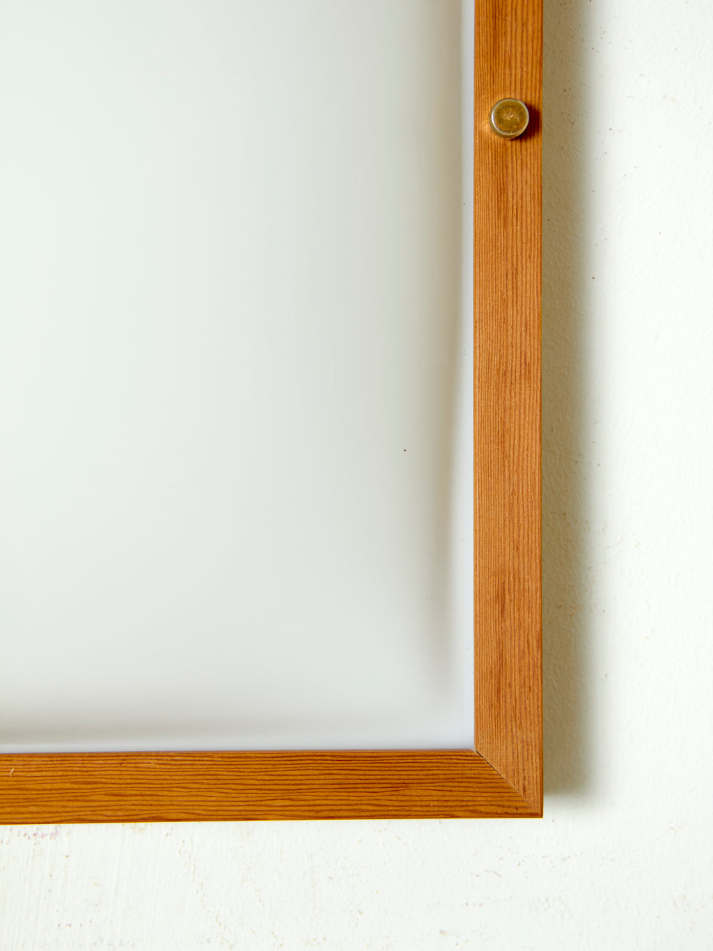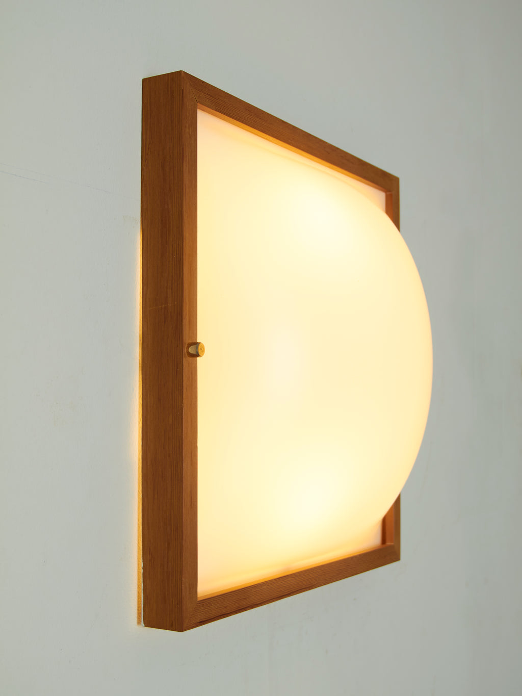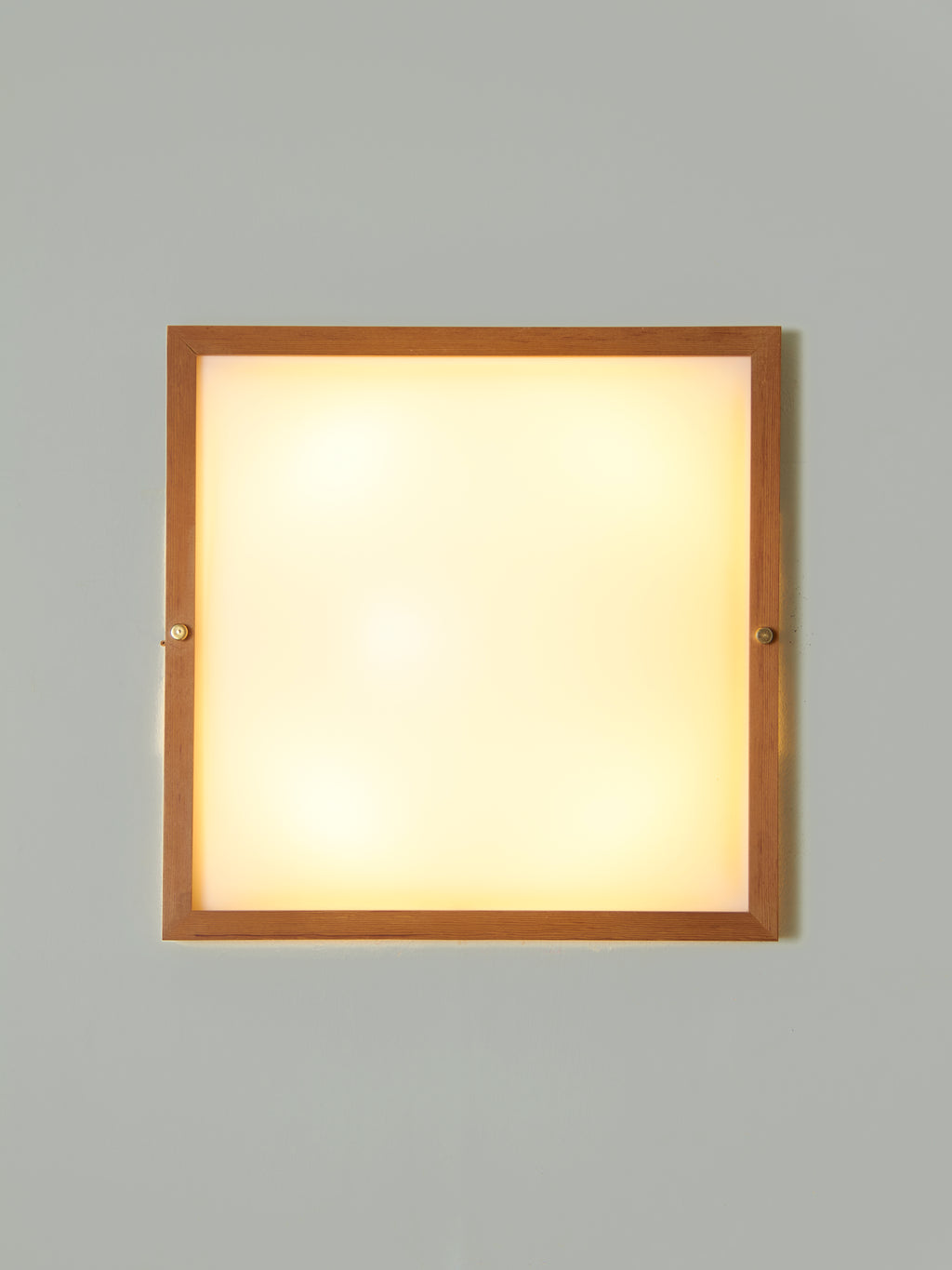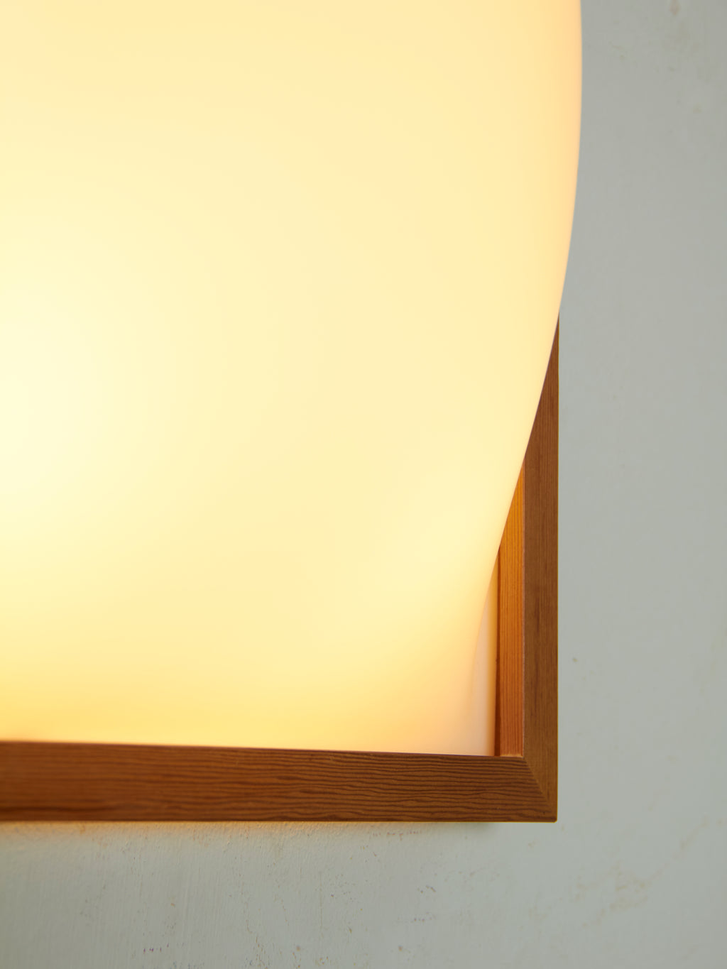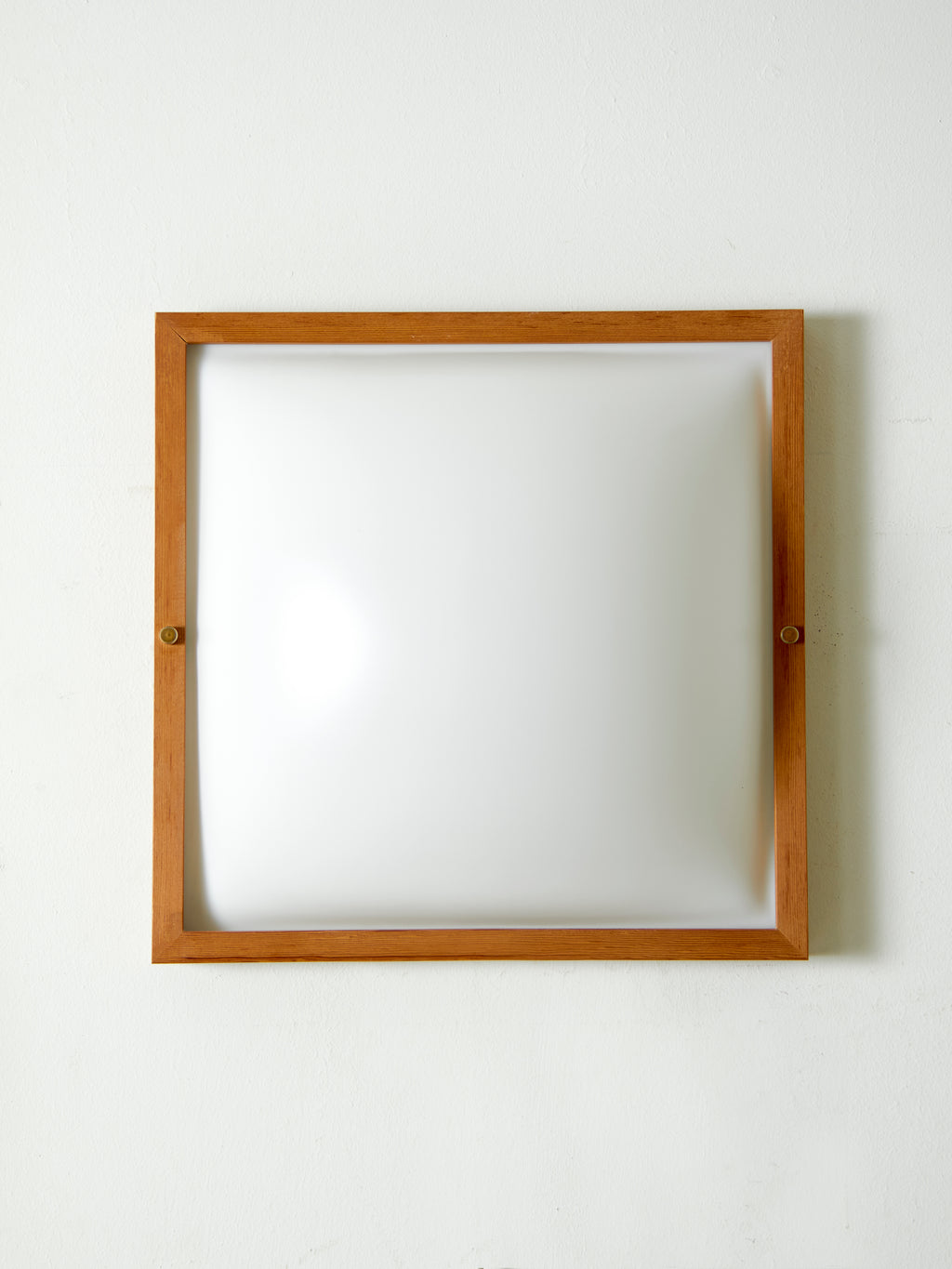 Gran aplic de paret produït als anys seixanta. Estructura quadrada en fusta de pi melis barnitzada i pantalla de metacrilat ondulat que aporta un aspecte lleuger al conjunt del disseny.