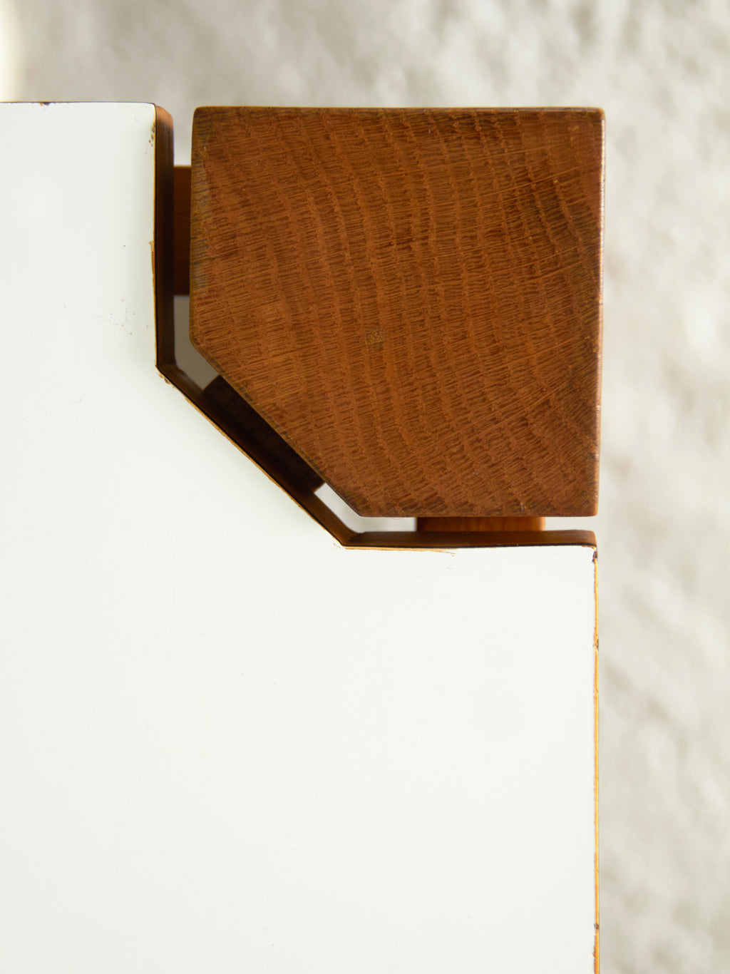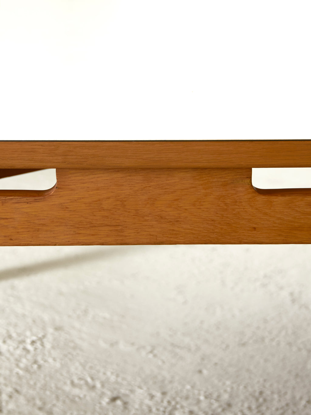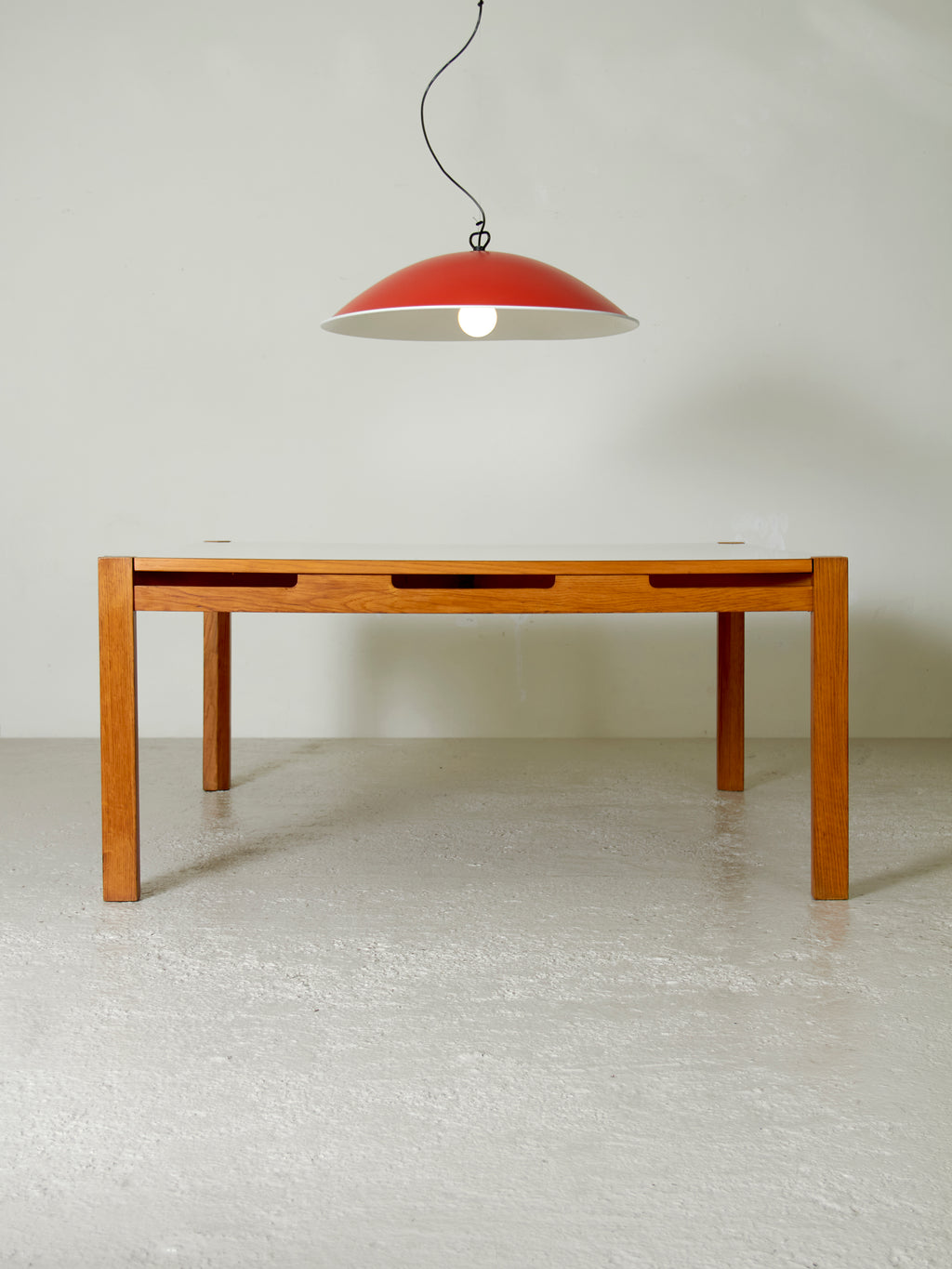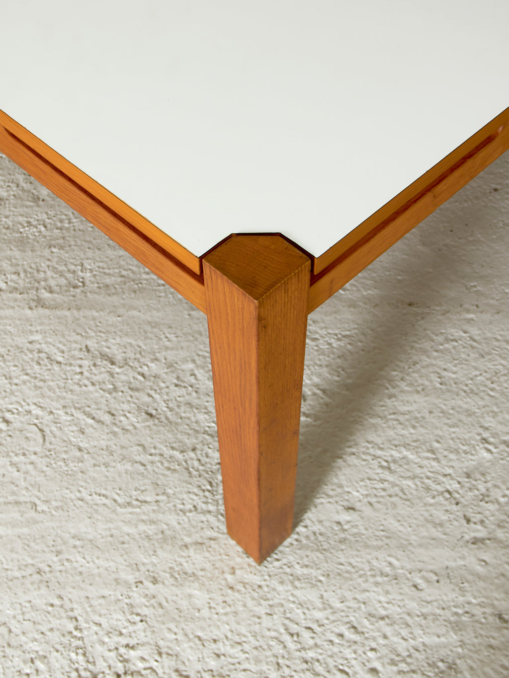 La taula està fabricada en fusta de roure barnissada, amb superfície quadrada en fórmica blanca i bonics detalls a les cantonades.