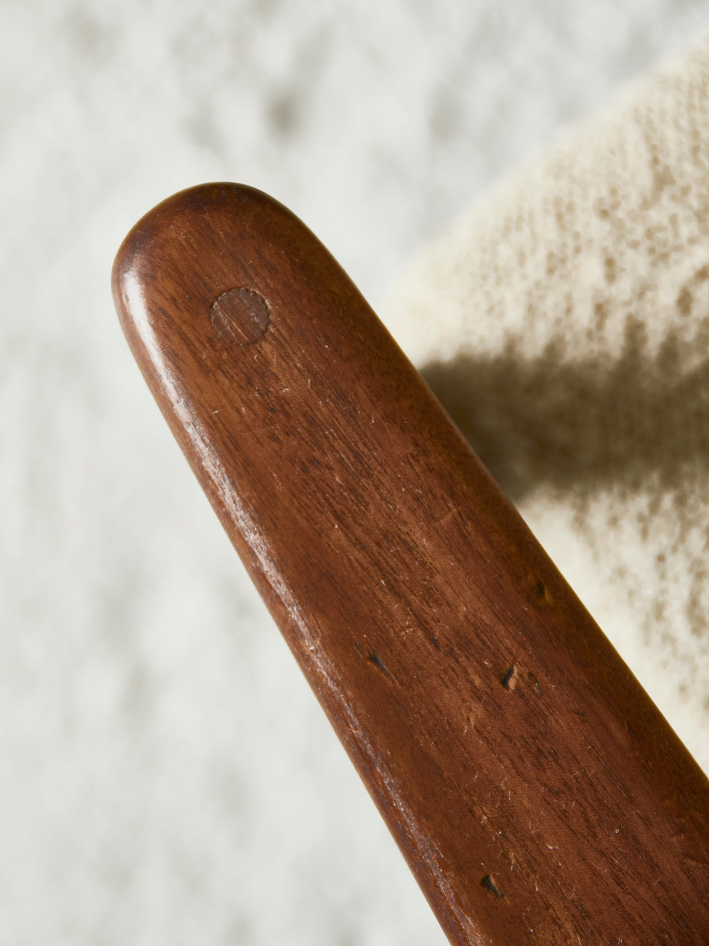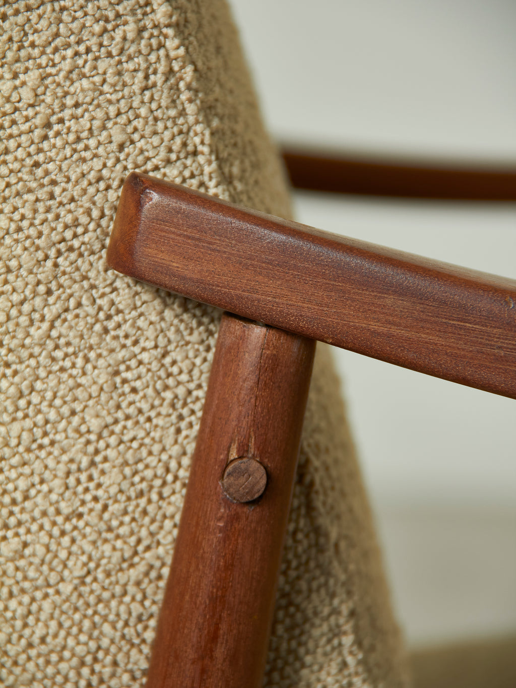 De gran qualitat constructiva i amb unes línies suaus i d’aspecte lleuger. Estructura de fusta i seient retapisserat en cotó beix.