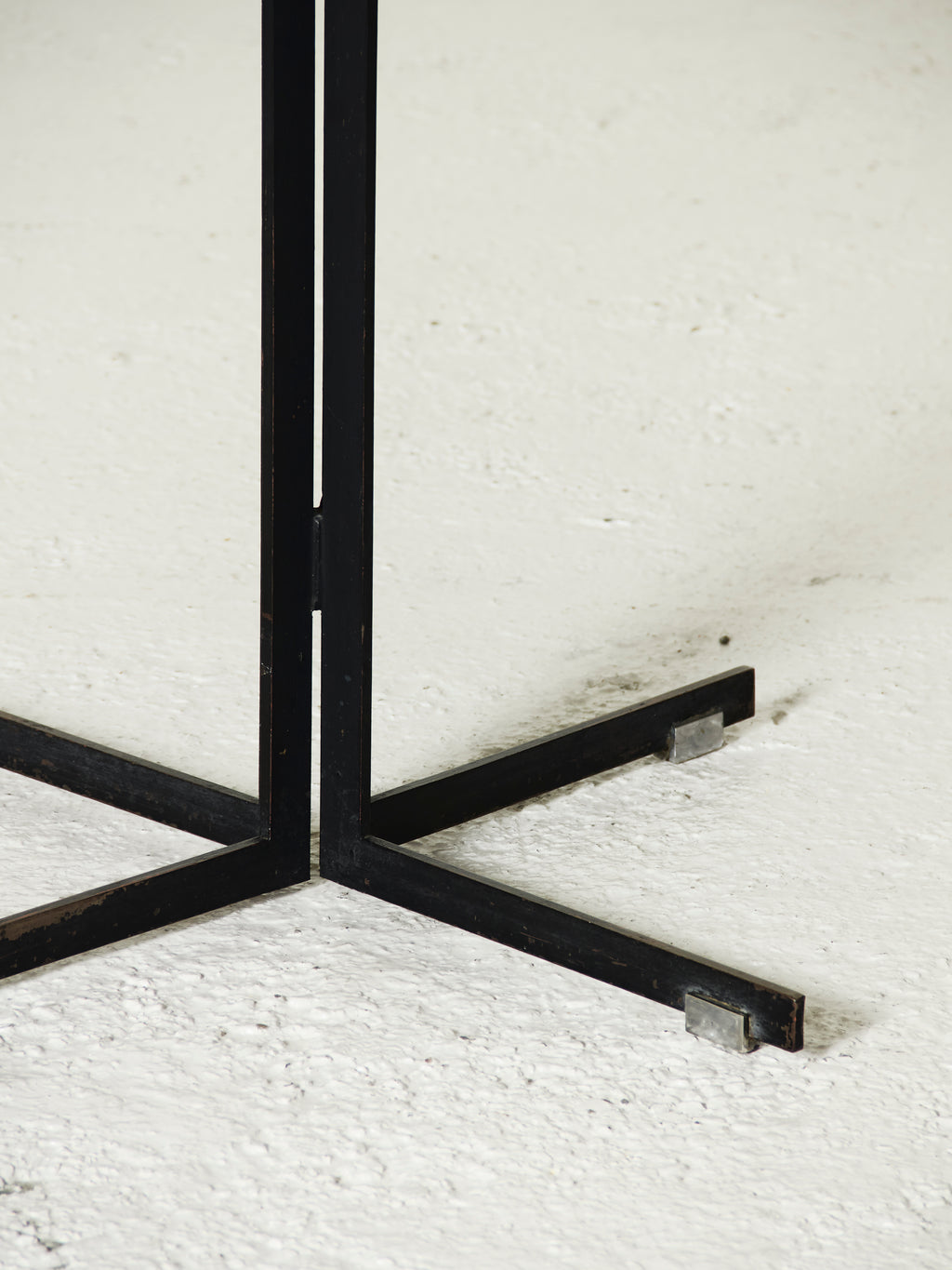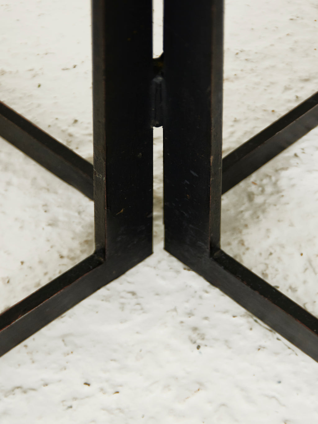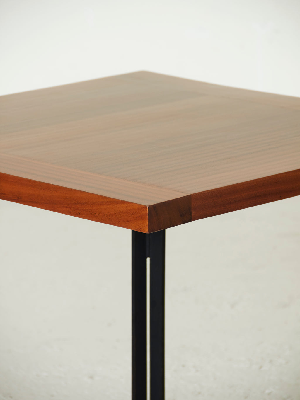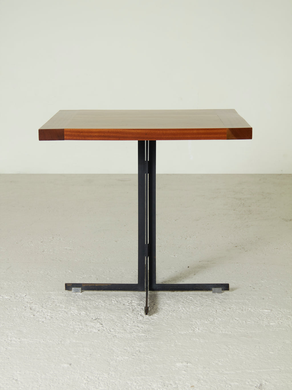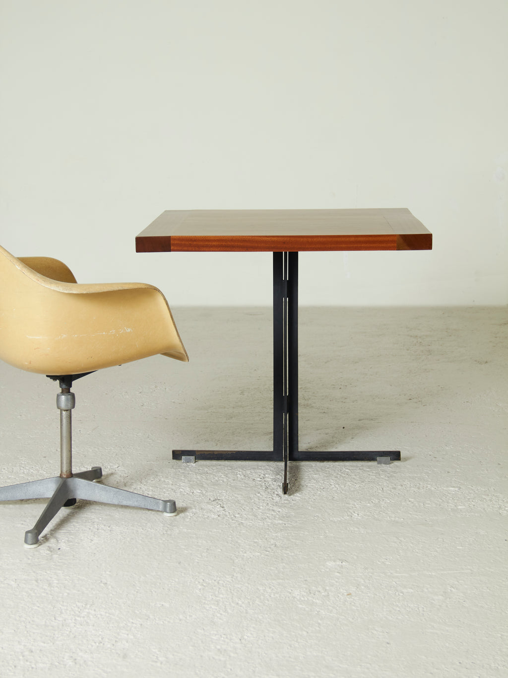 Taula de menjador d'estil racionalista produïda a la dècada dels seixanta. Peu metàl·lic en forma de creu amb detalls cromats sobre el qual es sustenta un sobre quadrat de fusta. De línies simples i suaus, destaca per la seva lleugeresa i elegància.
