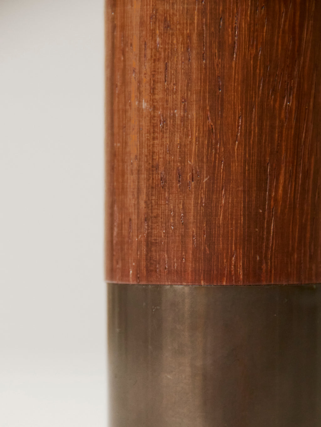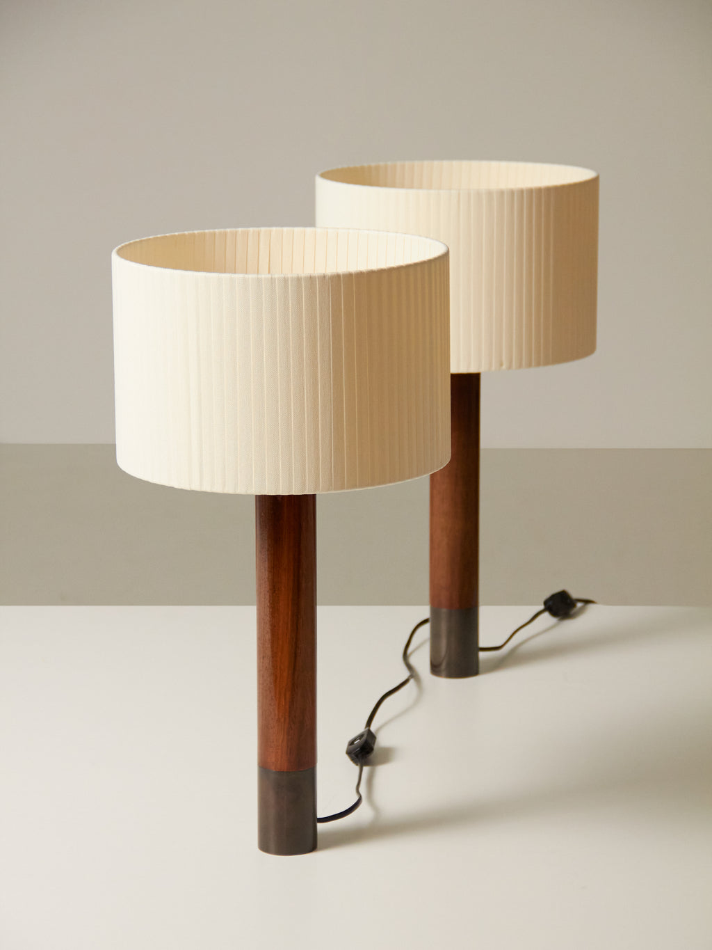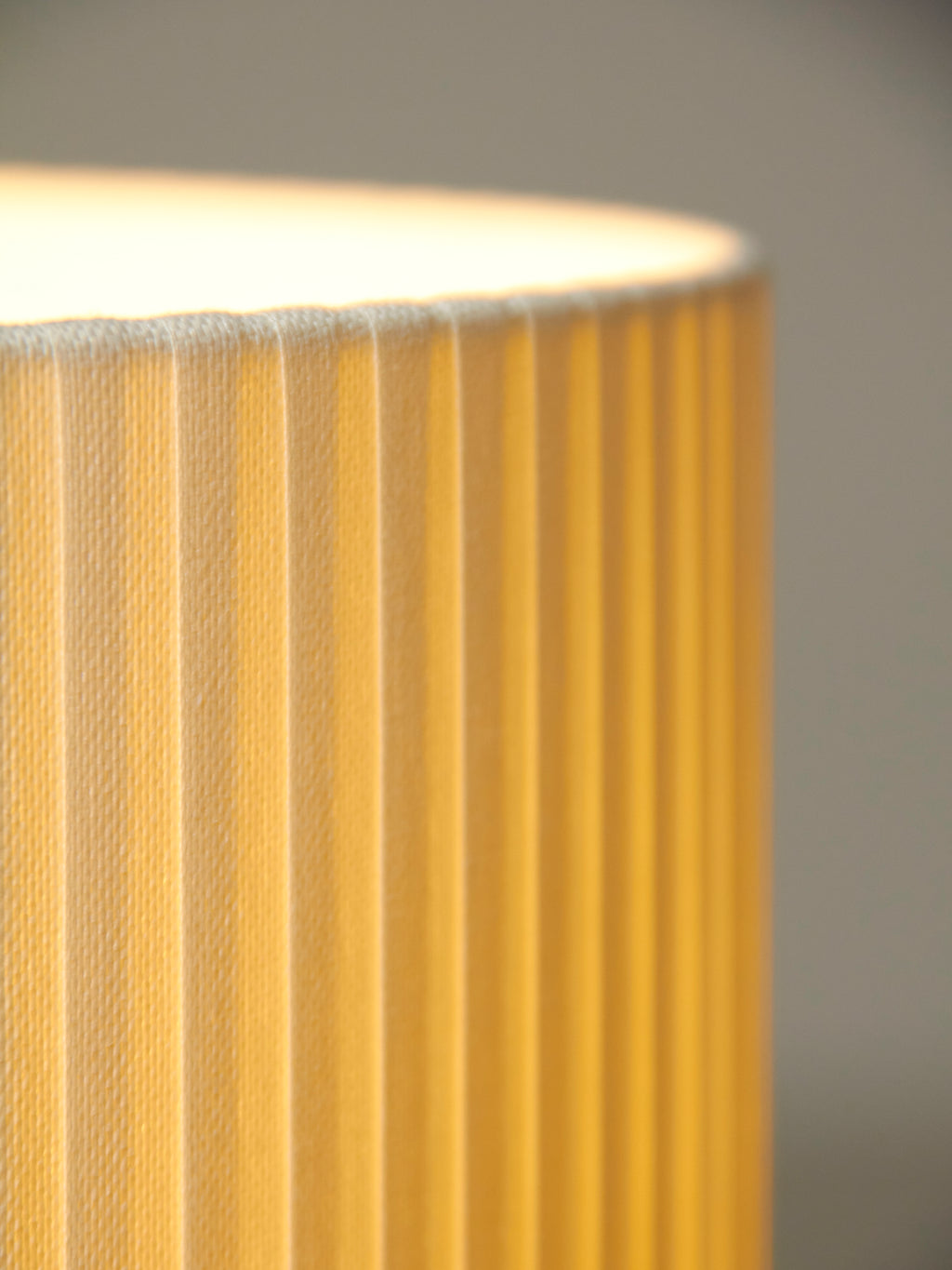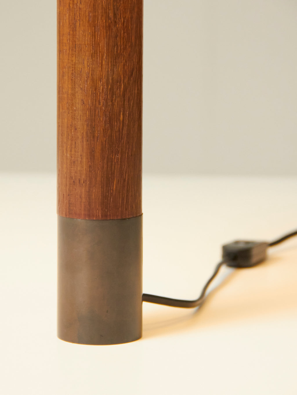 Consta de un cilindro de madera con una base metálica que proporciona equilibrio a la estructura y una pantalla redonda de cinta de tela.