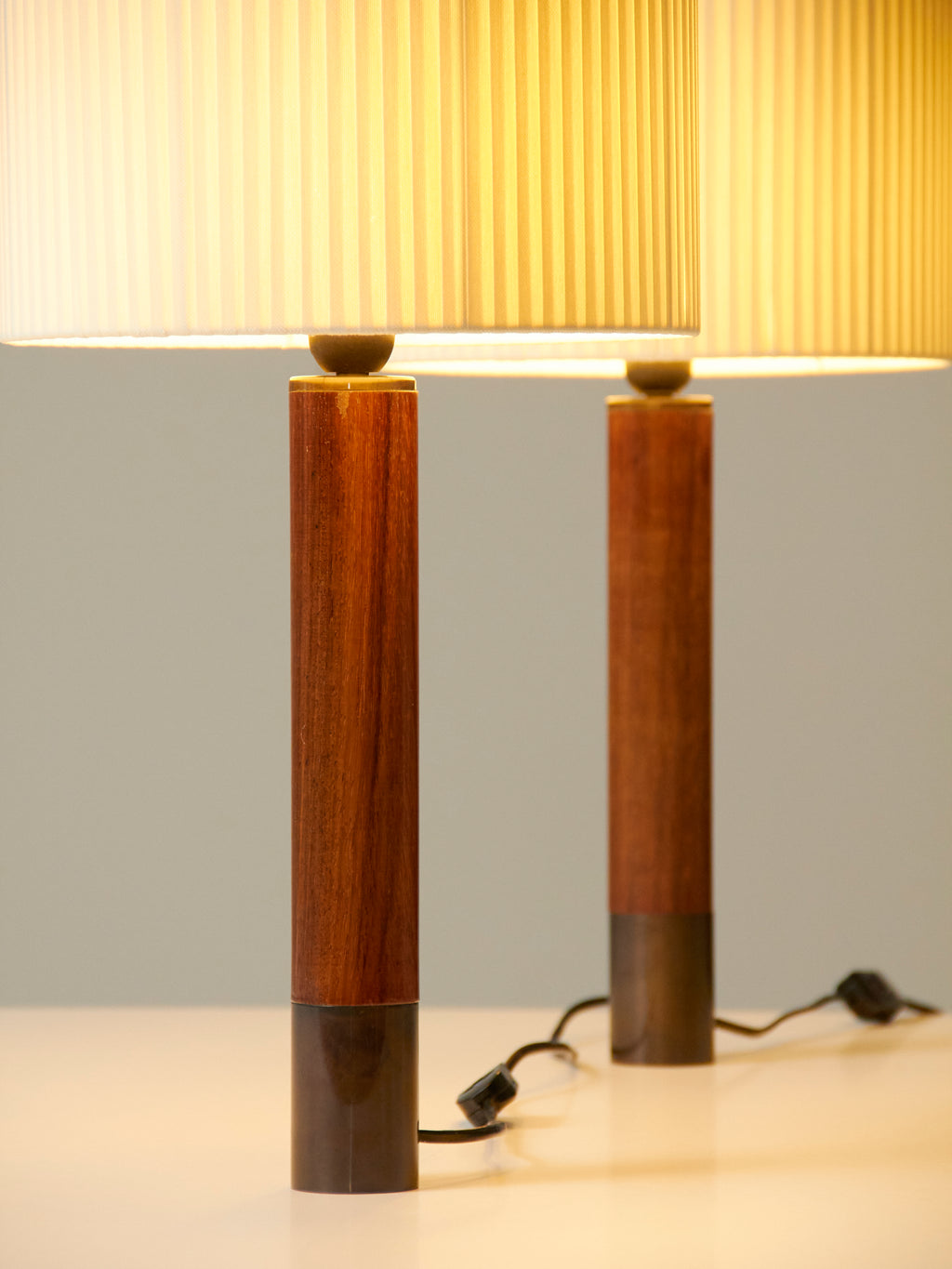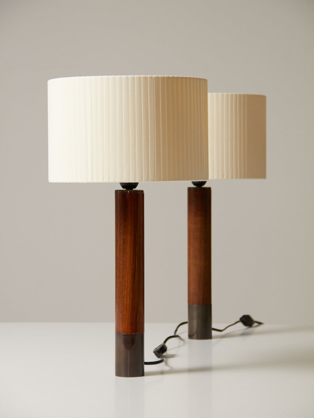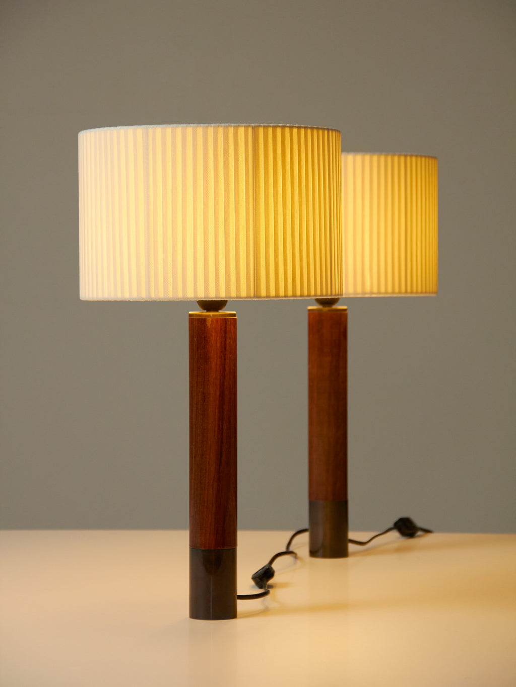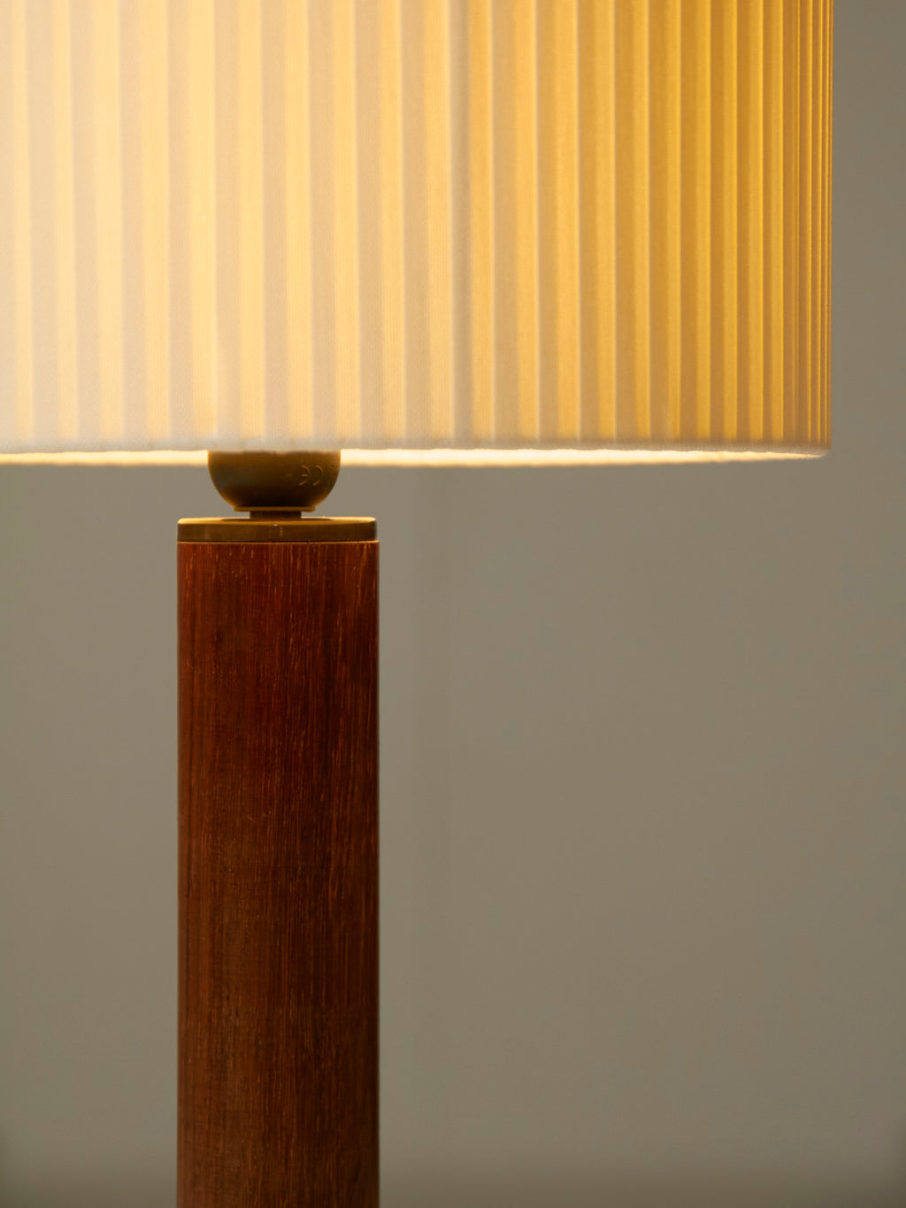 Consta de un cilindro de madera con una base metálica que proporciona equilibrio a la estructura y una pantalla redonda de cinta de tela.