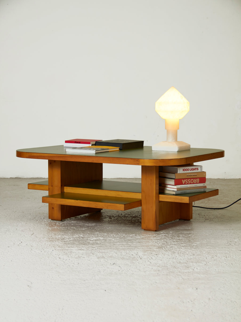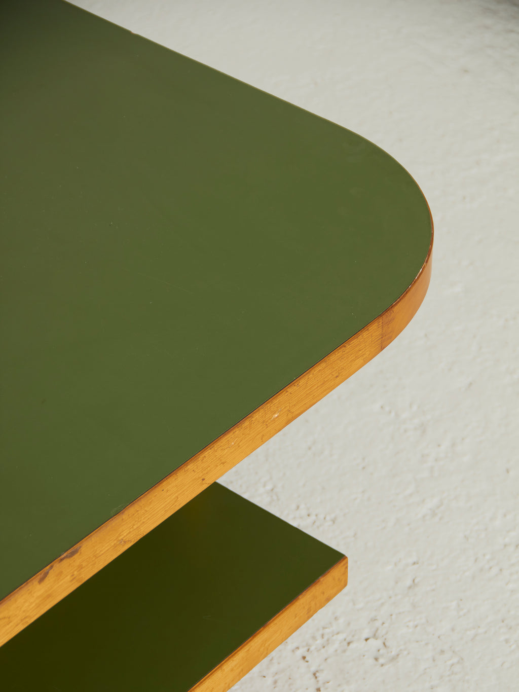 Mesa de centro diseñada y producida en los años sesenta. Una mesa de estilo brutalista y con un fuerte carácter arquitectónico, pero suavizado por sus formas redondeadas en el sobre y la combinación de la madera de pino melis y la fórmica verde.