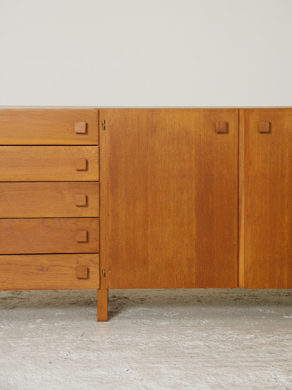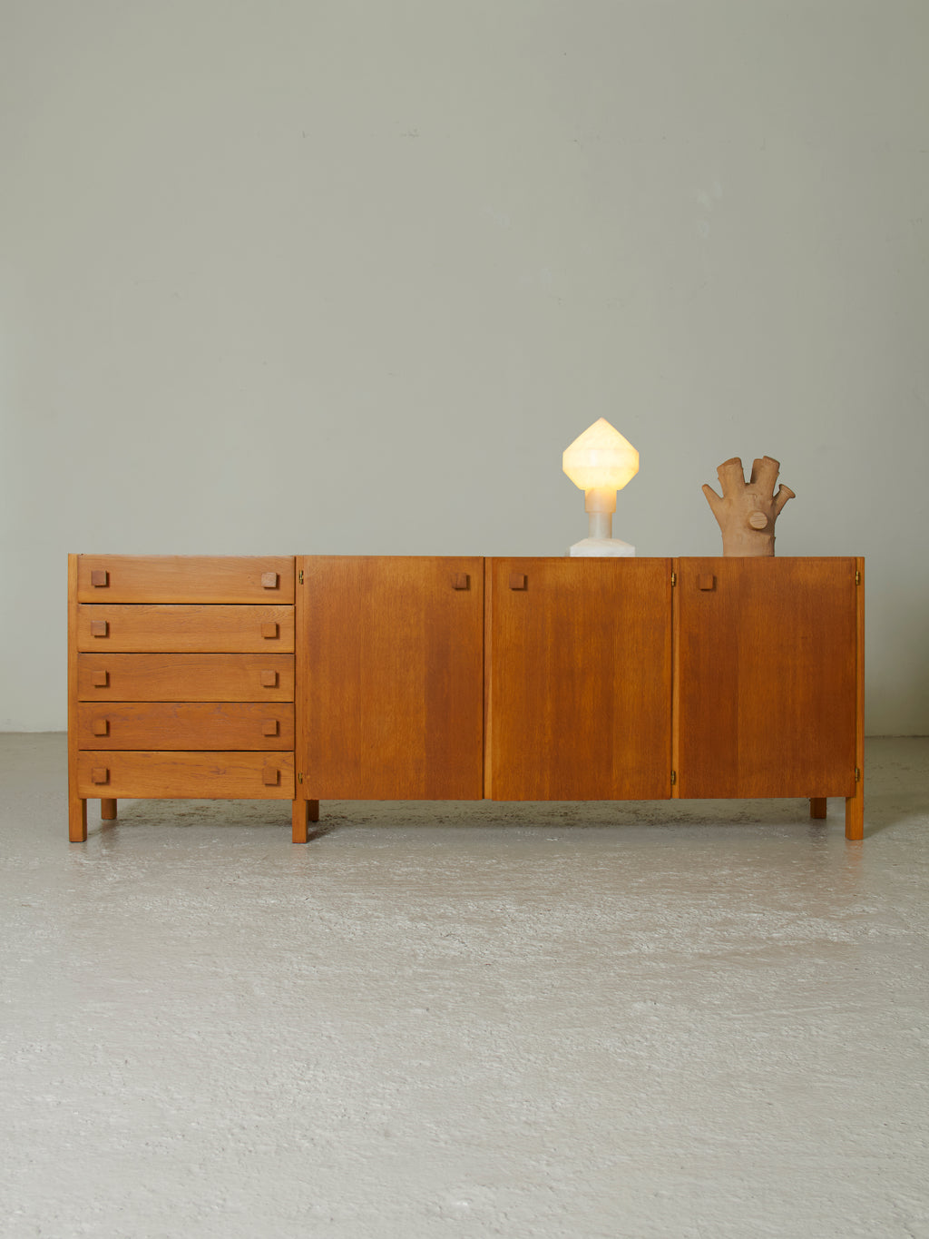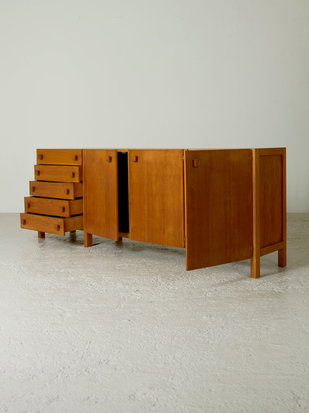 Este aparador representa un claro ejemplo del estilo que Casablancas desarrolló durante la década de los sesenta y los setenta: uso de la madera noble, perfiles rectilíneos y economía formal, marcando una época en el diseño de interiores catalán. Los tiradores cuadrados de madera se integran en un diseño que logra una perfecta sinergia entre la estética moderna y el carácter artesanal.