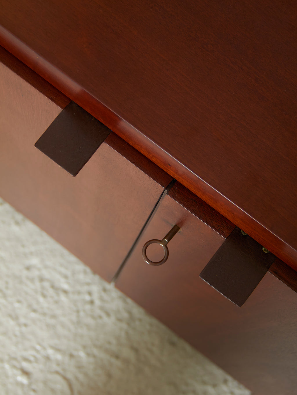 Se trata de un mueble de proporciones armónicas y estructura geométrica, de líneas limpias, cuyo diseño evita ser demasiado monolítico y pesado al incorporar dos patas corridas perpendiculares a la estructura. Dos hileras de cuatro cajones cada una presiden los laterales, mientras el centro del mueble queda definido por dos puertas.