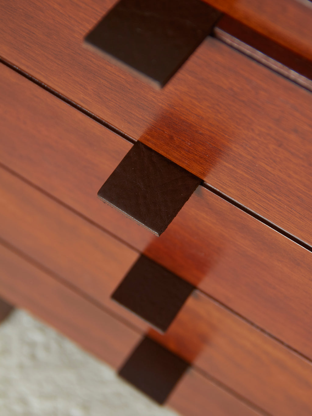 La estructura está realizada en madera barnizada y los tiradores en cuero.