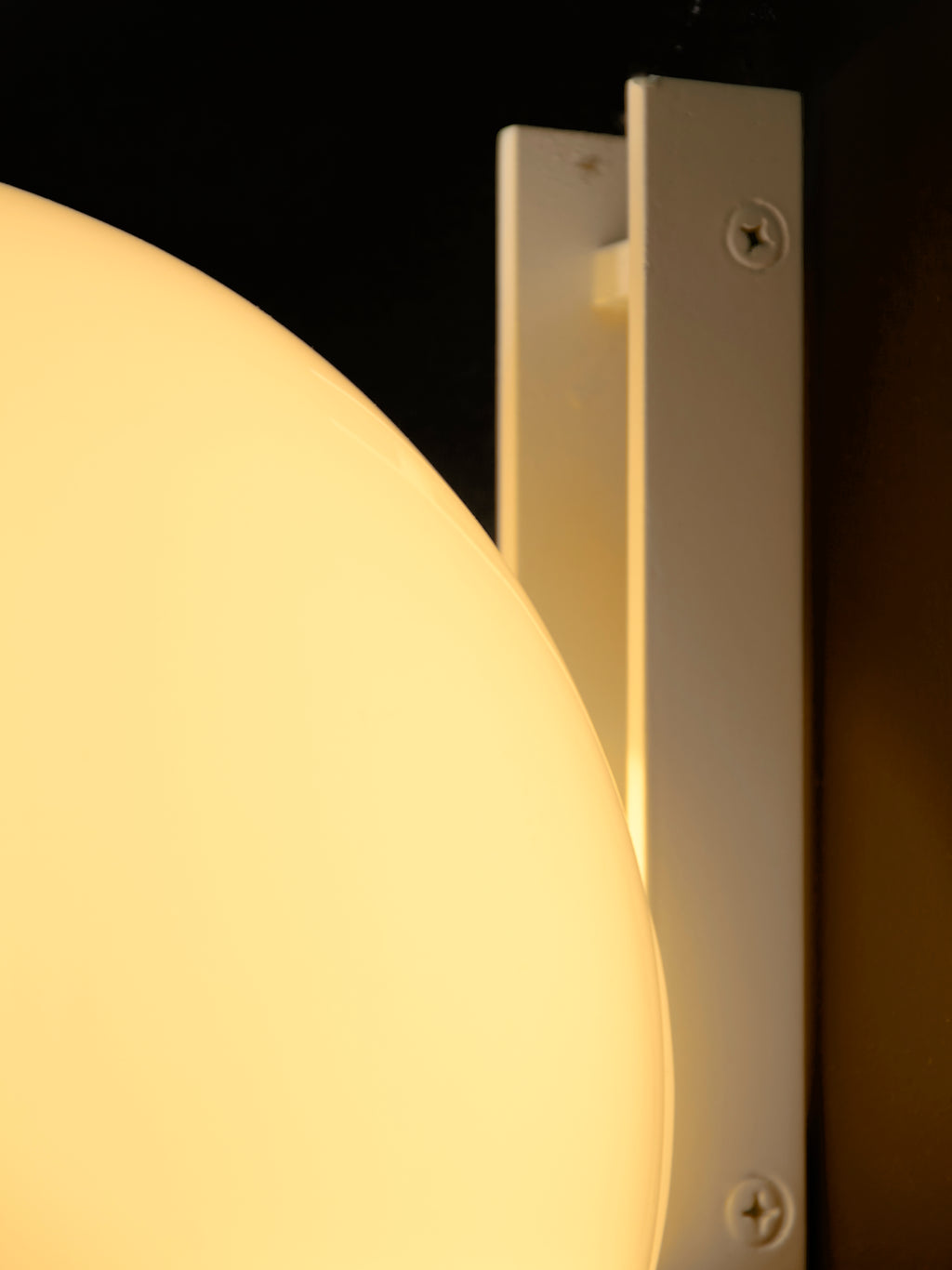 Estructura de hierro pintado en blanco en forma de aro que soporta un globo de cristal de opalina.