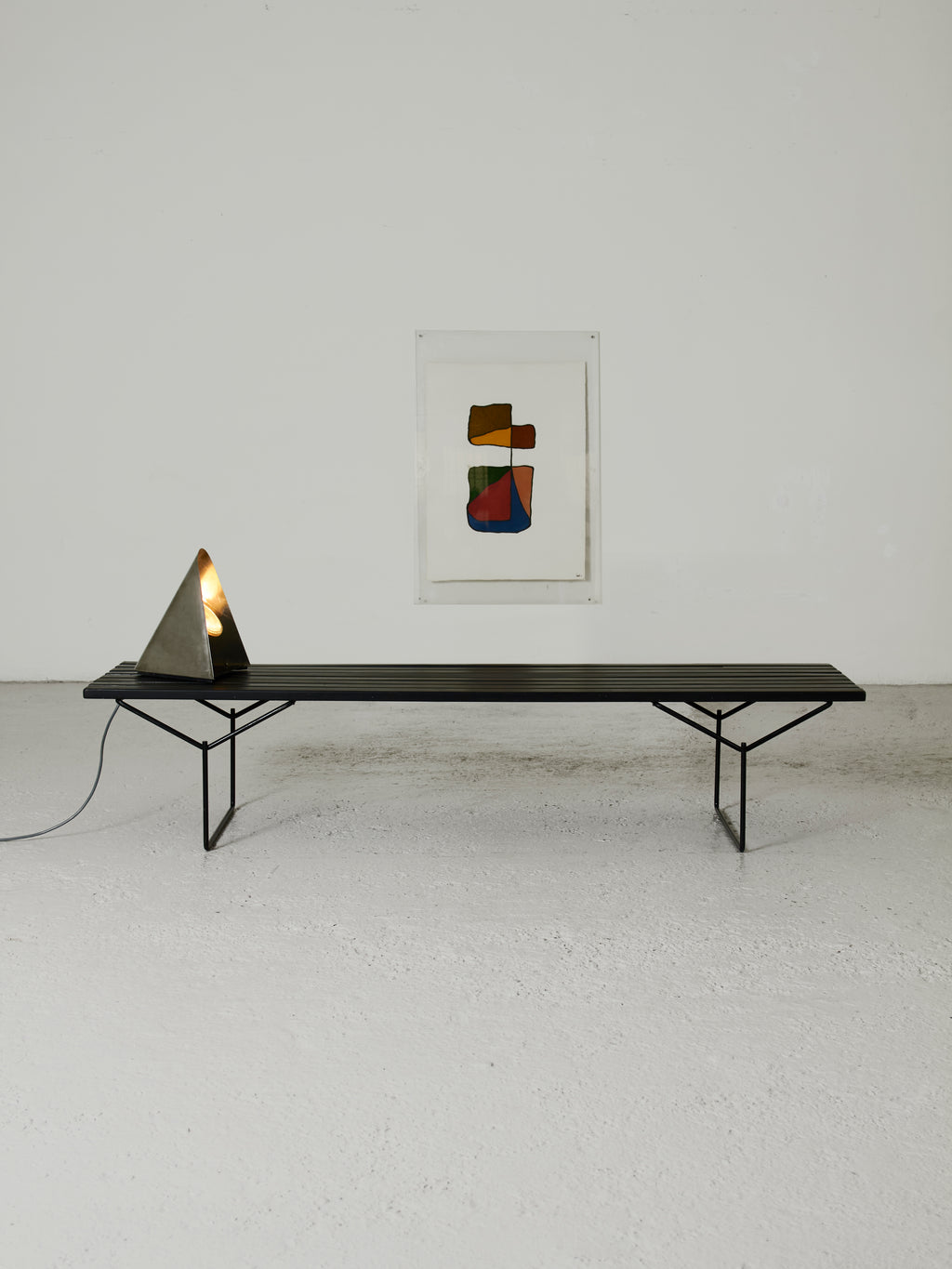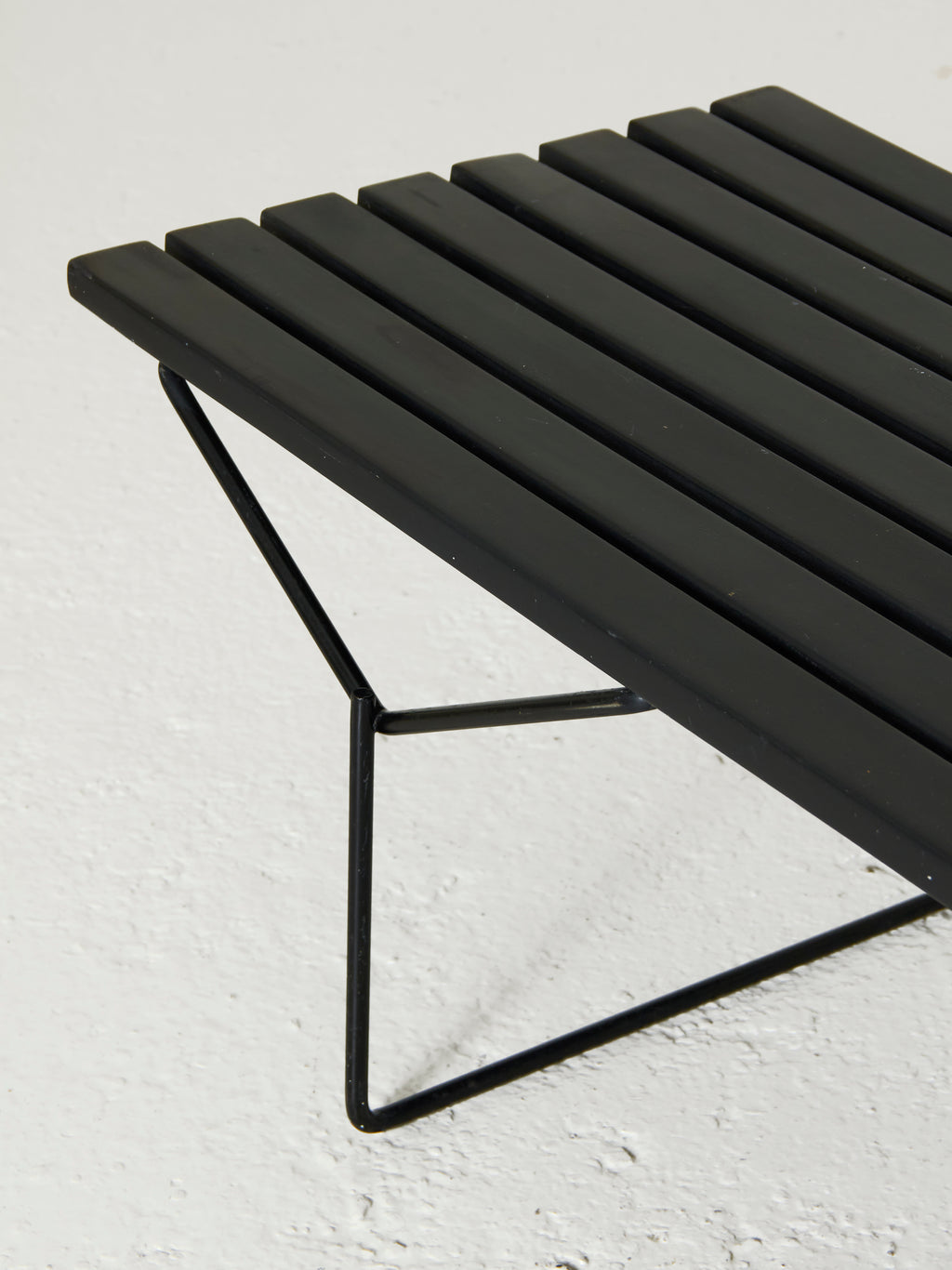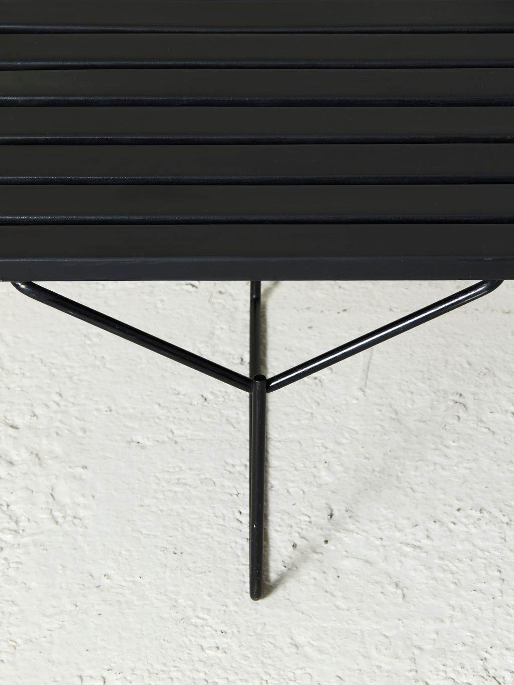 Diseñado hacia 1960 por Harry Bertoia para Knoll International, el banco Bertoia es una pieza icónica del mobiliario moderno norteamericano. Realizado con asiento de lamas de madera lacadas en negro y estructura de varilla de hierro, su diseño combina ligereza visual, rigor escultórico y funcionalidad, rasgos característicos de la obra del autor.