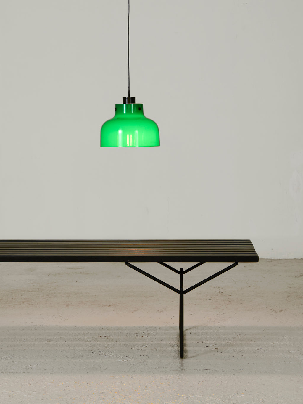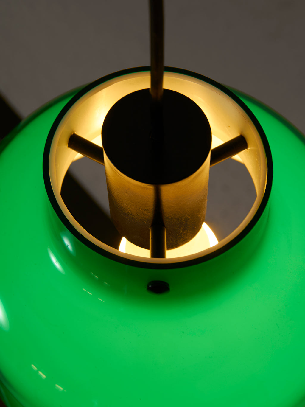 Doble pantalla bicolor de metacrilato inyectado, color verde en el exterior y blanco en el interior. Una elegante pieza une el portalámparas con la pantalla.