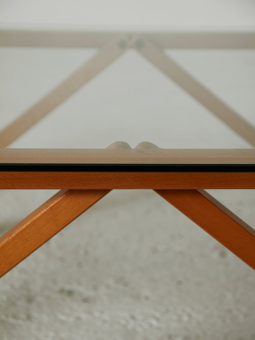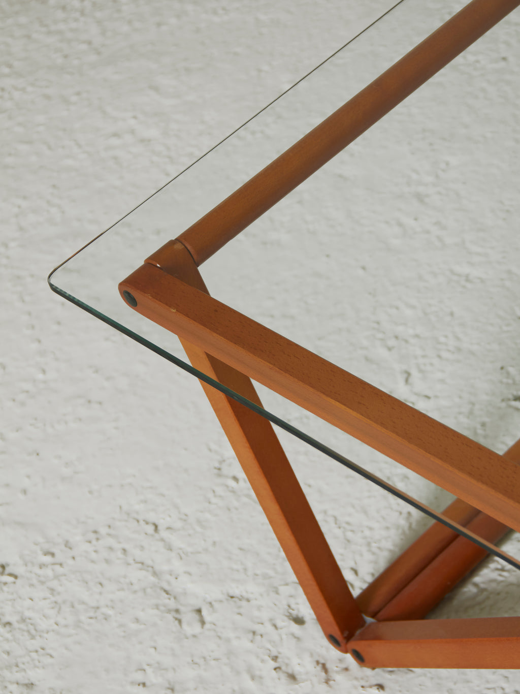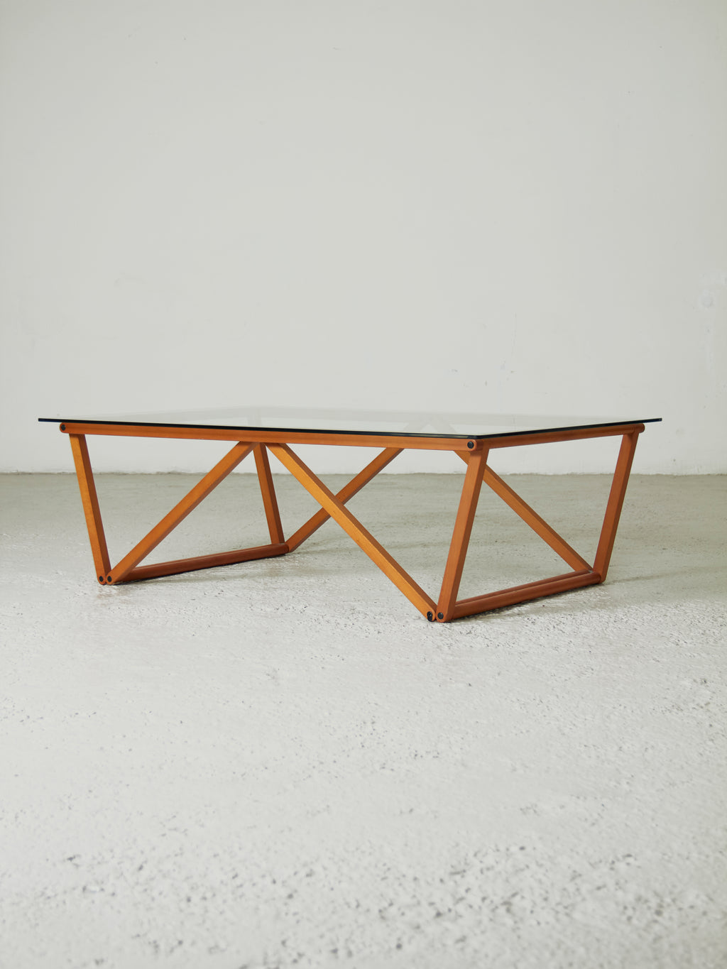 Mesa de centro producida por la editora Scarabat en los años ochenta. Estructura a partir de un juego de listones de madera de cerezo y sobre de vidrio.