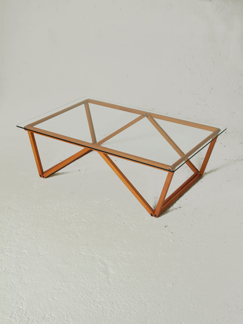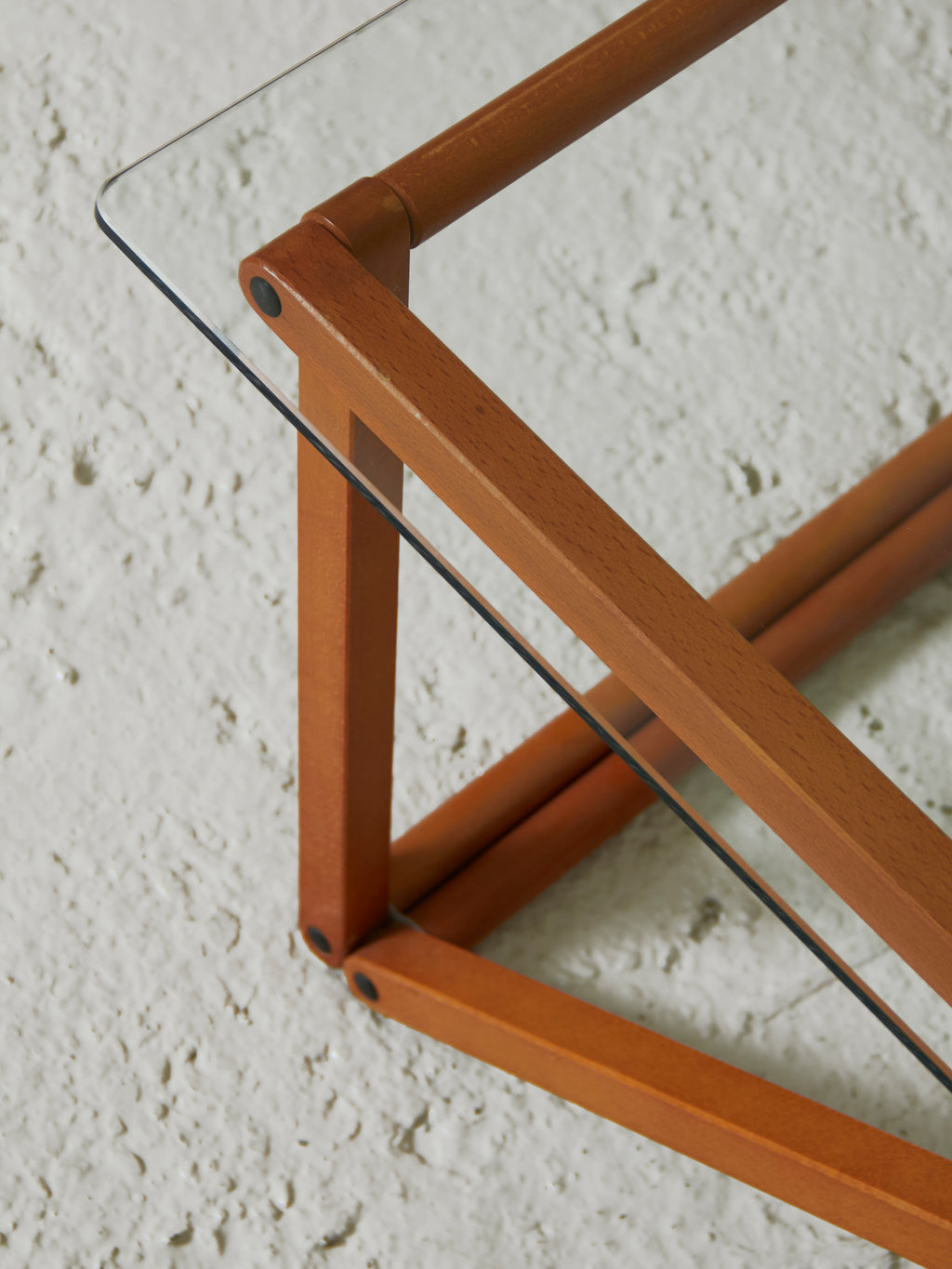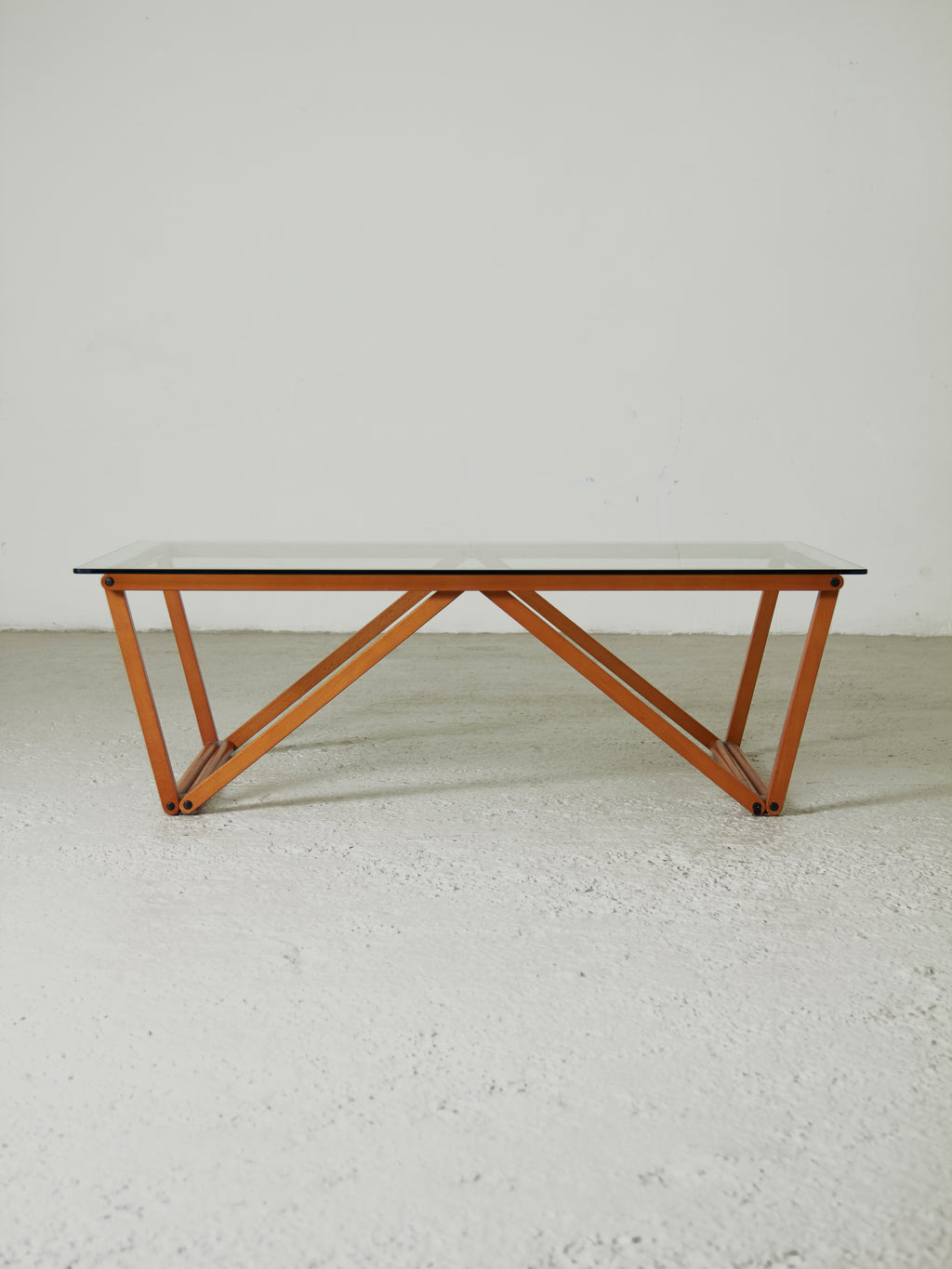 Mesa de centro producida por la editora Scarabat en los años ochenta. Estructura a partir de un juego de listones de madera de cerezo y sobre de vidrio.