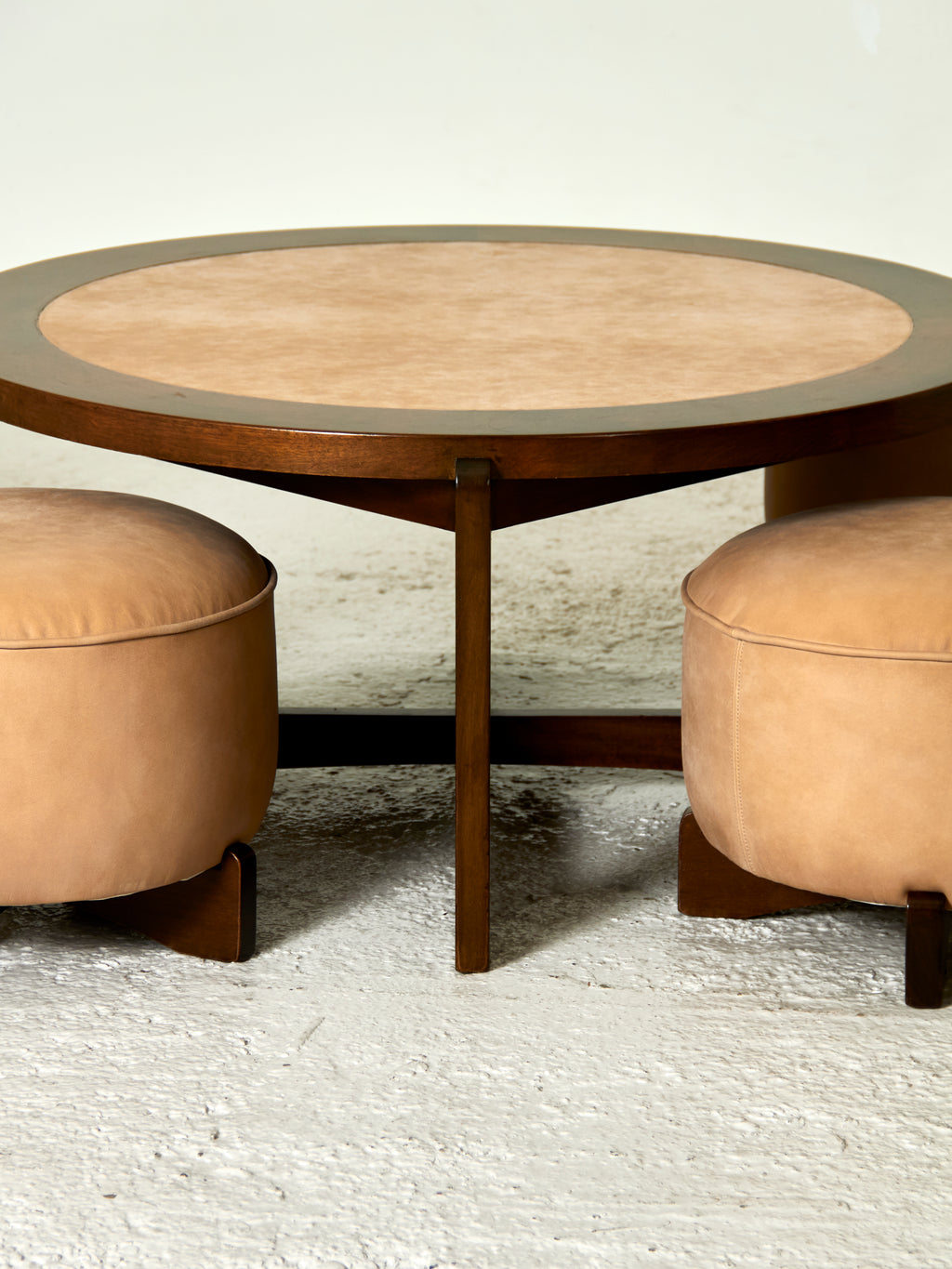Conjunto de mesa de centro y cuatro taburetes diseñado por Jordi Vilanova en la década de los sesenta. Es un claro exponente de la estética vanguardista que proyectó al diseñador. En madera de nogal y piel color camel.