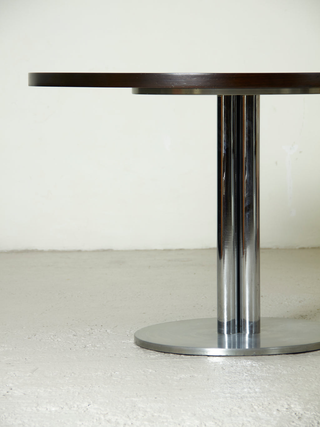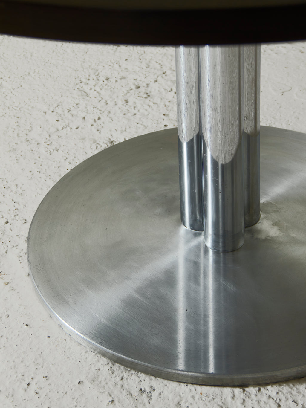 A partir de un pie compuesto por treso cilindros de acero cromado que convergen y funcionan como soporte para el sobre, de madera barnizada.