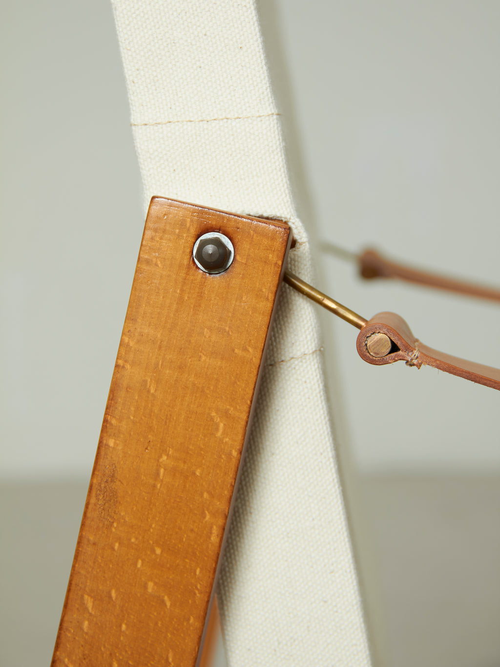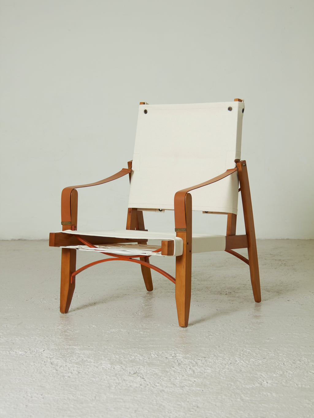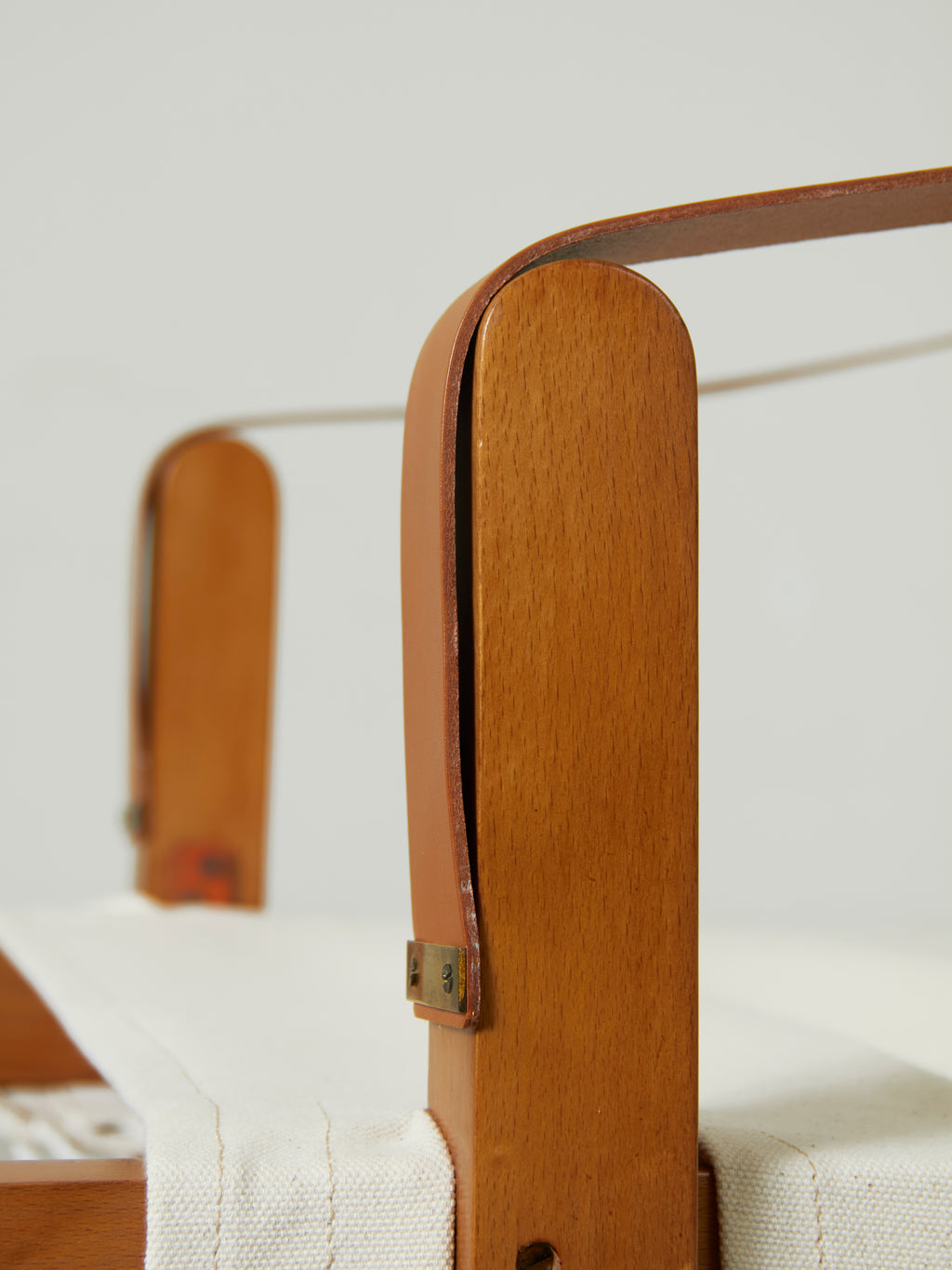 Estructura en madera de haya barnizada y elementos de hierro pintado con forma curva. Los brazos están compuestos por una banda de cuero y sujeciones metálicas y el respaldo y el respaldo son de lona desenfundable.