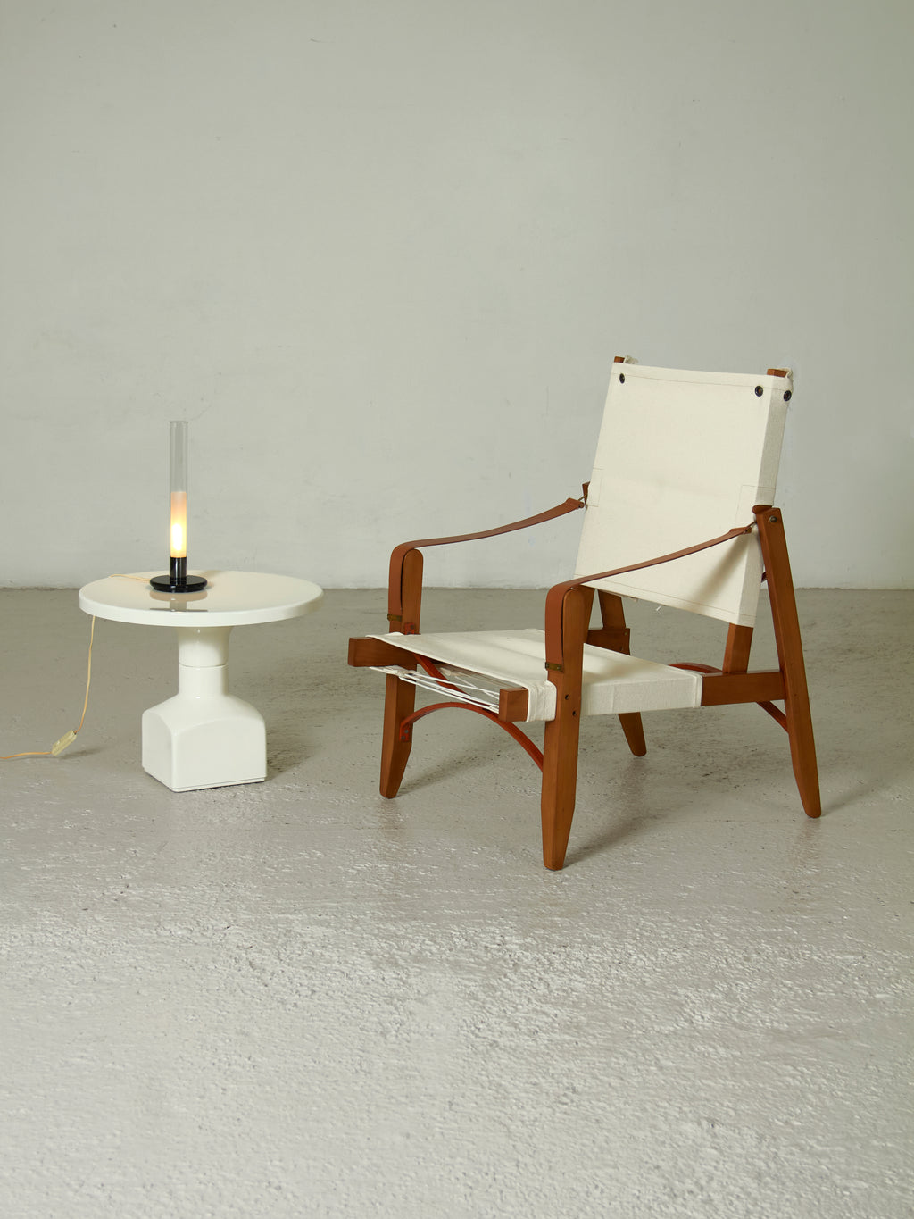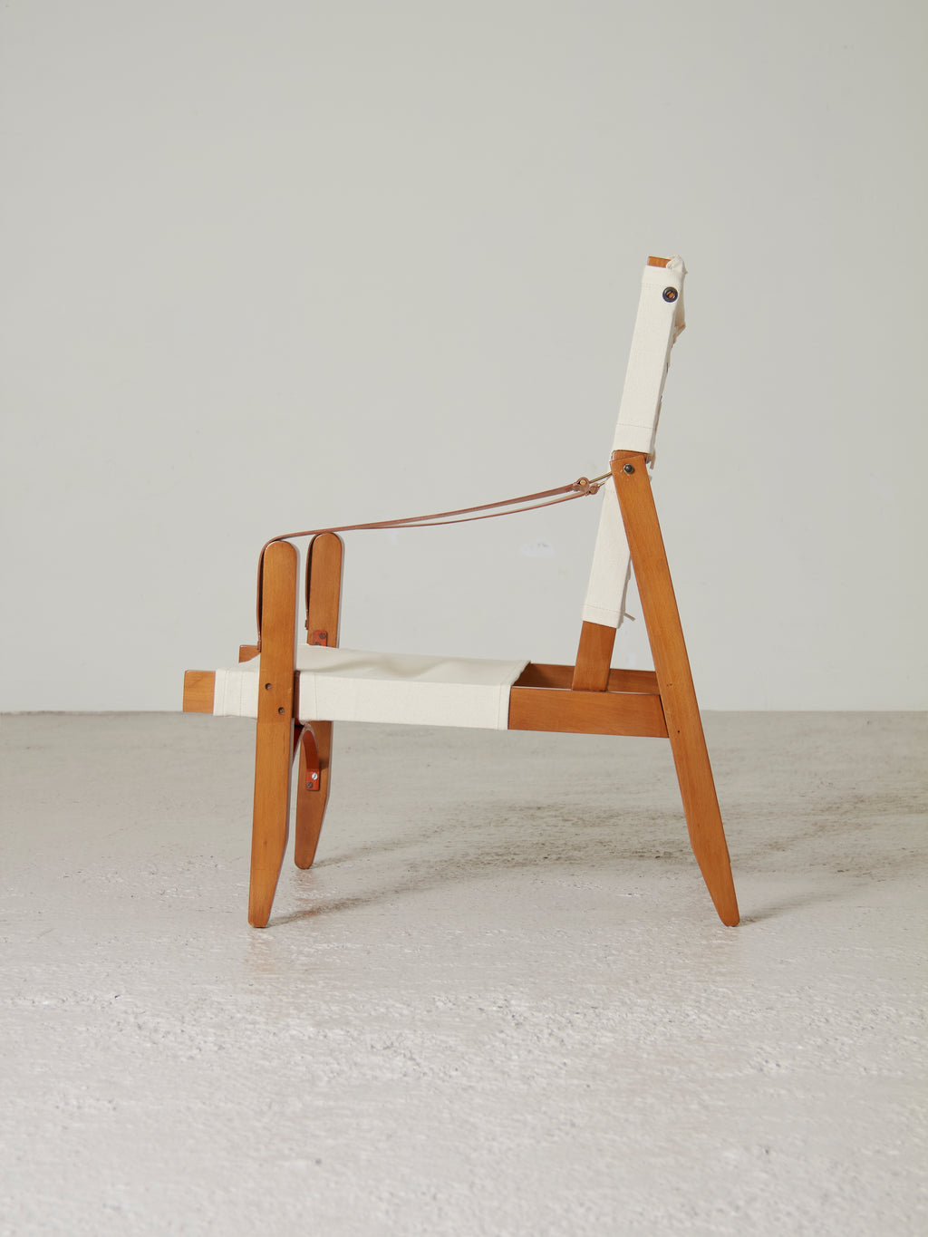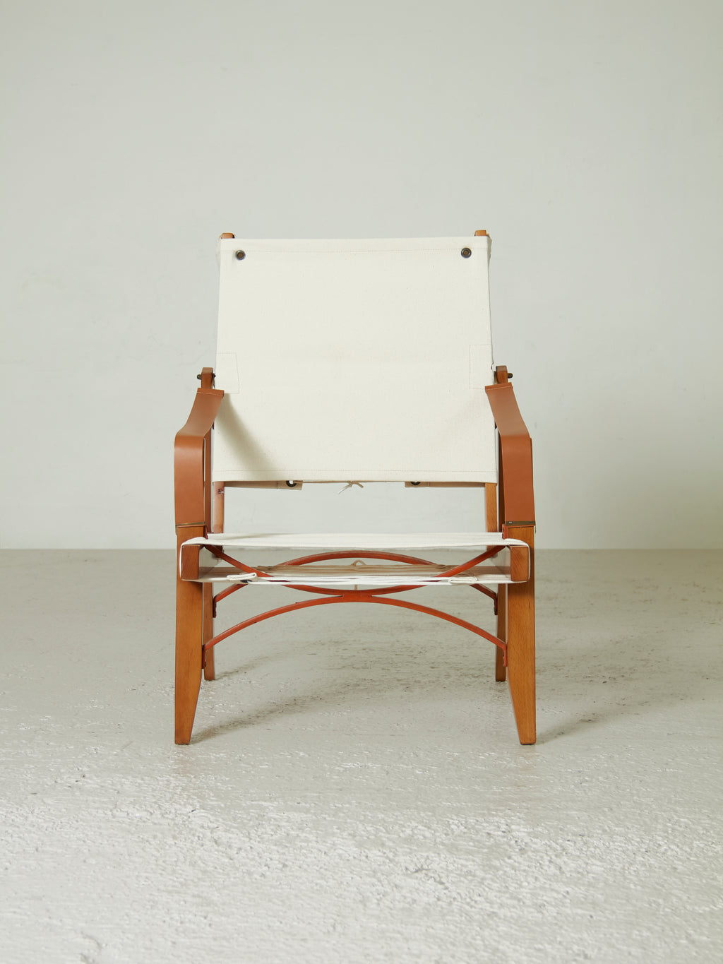 Estructura en madera de haya barnizada y elementos de hierro pintado con forma curva. Los brazos están compuestos por una banda de cuero y sujeciones metálicas y el respaldo y el respaldo son de lona desenfundable.