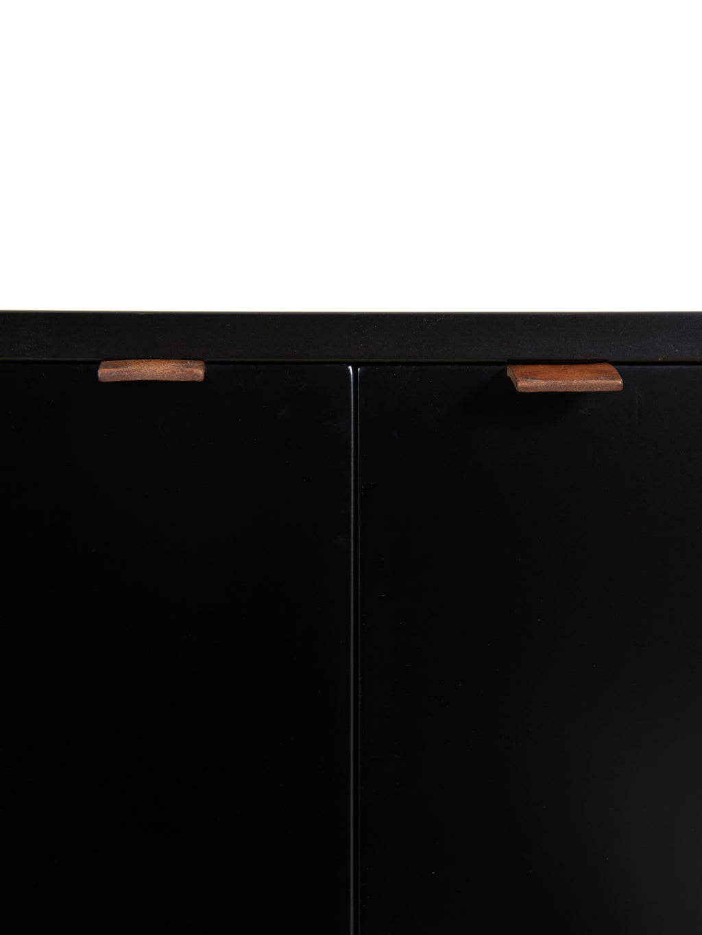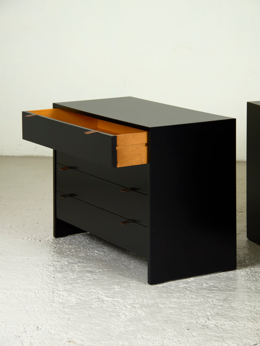 Rectangular in shape, in one case it has two doors and in another case it has four drawers with leather handles. Interior and exterior in varnished ukola wood.