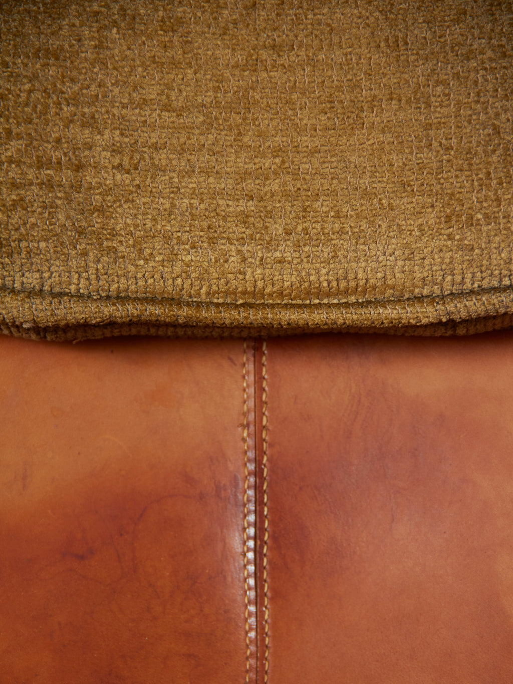 Structure in stained beech wood and seat in vaquetilla leather with a beautiful patina on the whole. It also includes a velvet upholstered cushion for added comfort.
