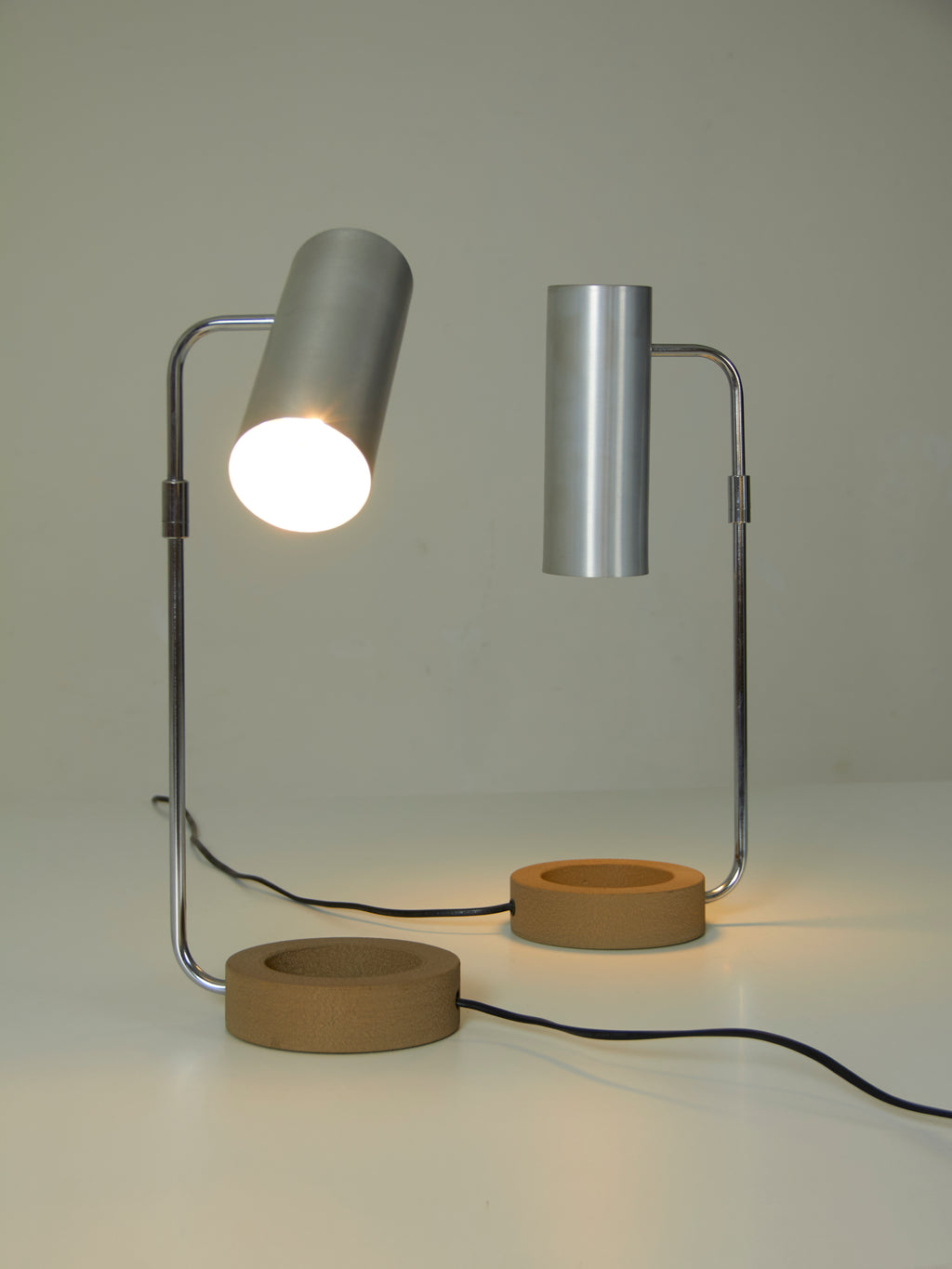 Table lamp designed by Paul Mayen and produced by Habitat, featuring a brown stone base, a slender chromed iron stem, and an adjustable tubular shade. A modern and minimalist design that casts a warm light.