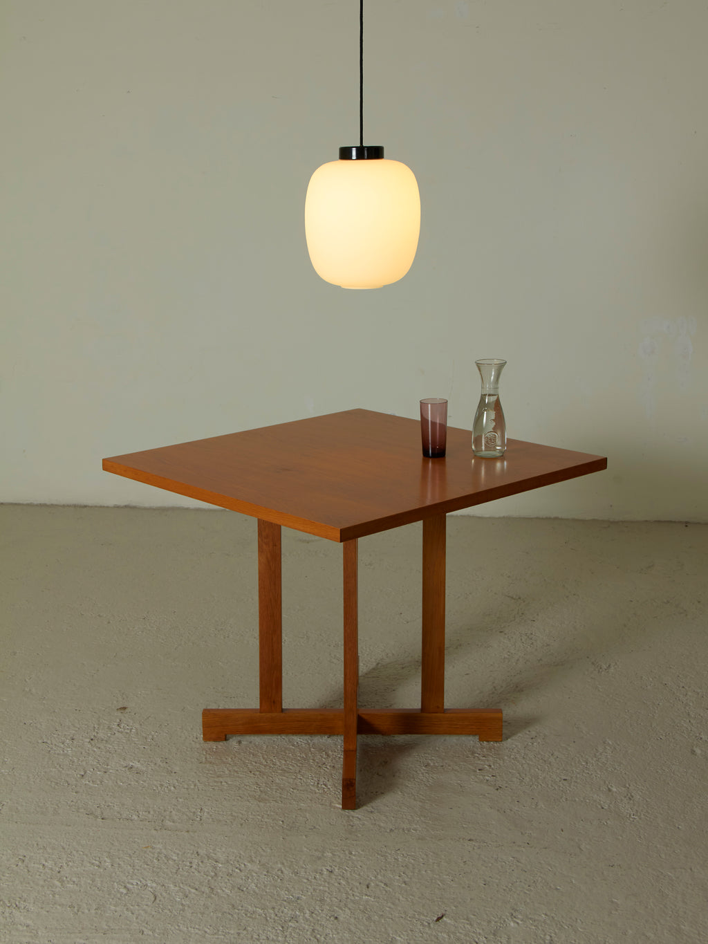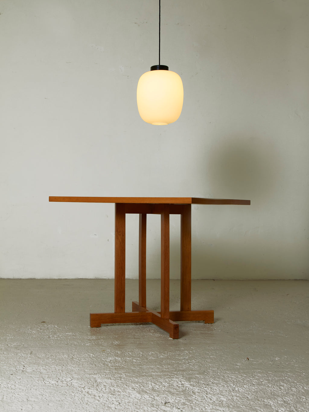 The table is made of varnished oak wood, with a square top and cross-shaped legs.