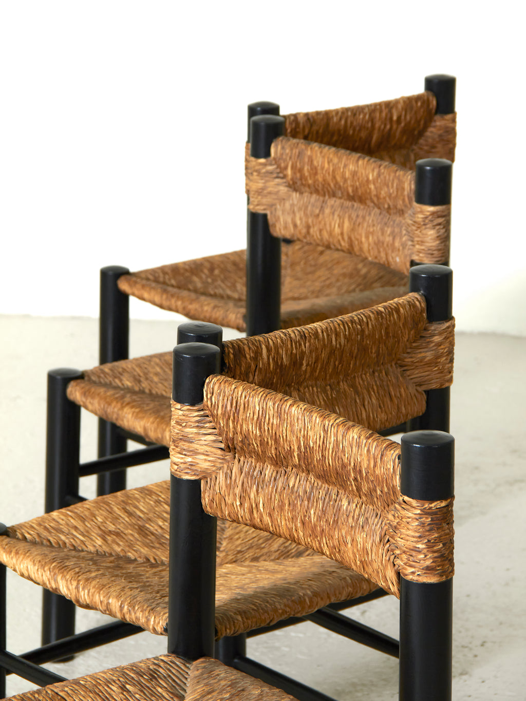 A classic of popular furniture from the sixties and seventies. Handmade, the frame of these chairs is made of solid wood and the seat and backrest of woven rush.